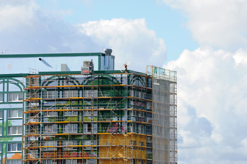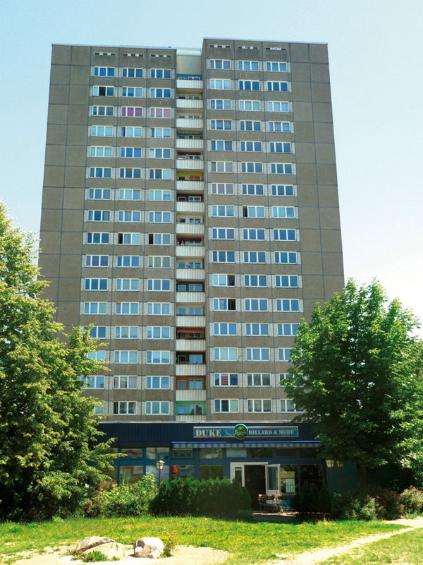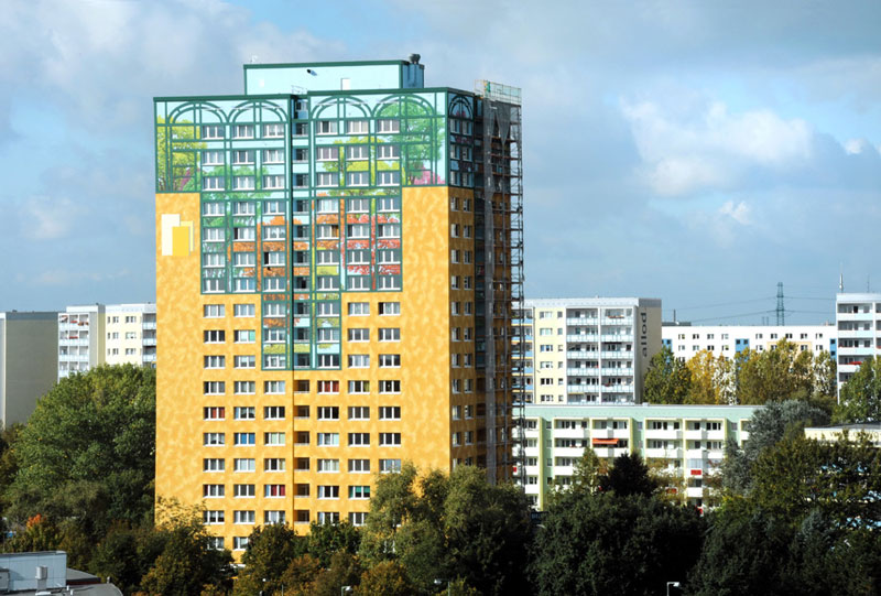 Das Wohnhochhaus der Wohnungsgenossenschaft FRIEDENSHORT eG liegt mitten in Marzahn an der Kreuzung Poelchaustraße/Allee der Kosmonauten, einem verkehrsreichen Knotenpunkt. Wegen dieser prominenten Lage, der enormen Gebäudehöhe und der solitären Architektur steht es täglich im Blickpunkt vieler Menschen. Deshalb beschloss FRIEDENSHORT, die notwendige energetische Sanierung der Gebäudehülle mit einer optischen Aufwertung zu verbinden und so einen städtebaulichen Akzent zu setzen. Sie beautragte die weltweit agierenden Künstlergruppe CitéCréation mit der Fassadengestaltung. Themengebend für den künstlerischen Gestaltungsentwurf waren das markante grüne Wohnumfeld und die Gärten der Welt, eine Marzahner Sehenswürdigkeit, die über die Bezirks- und Landesgrenzen hinweg auf große Sympathie trifft.Die Künstler versahen den monolithischen Baukörper mit einem „Glasturm“, der den Blick in Baumwipfel und in den Himmel freigibt. Die Fassadenabschnitte im Erdgeschoss des Gebäudes zeigen Landschaftsmotive mit typischen Pflanzen und Gewächsen aus unterschiedlichen Regionen der Welt.